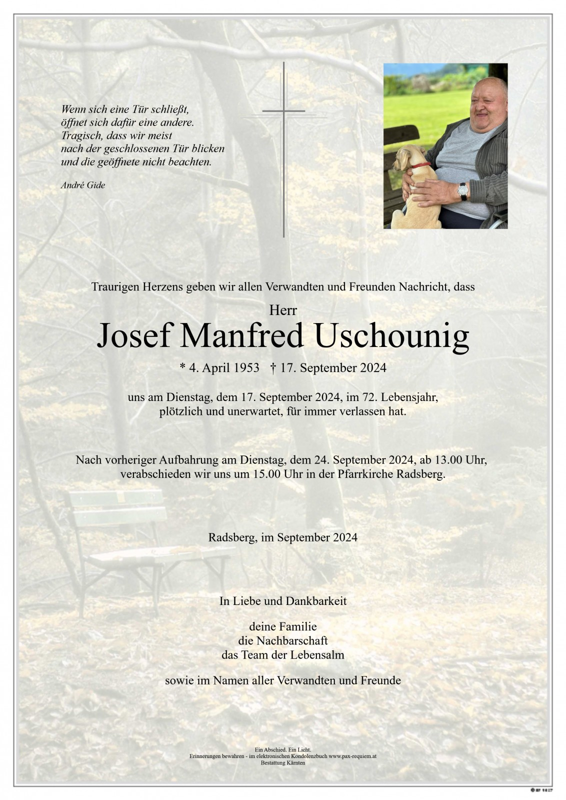 Die Möglichkeit, neue öffentliche Kondolenzeinträge zu verfassen, wurde auf Wunsch der Angehörigen beendet. Wir bitten um Verständnis dafür, dass keine weiteren Einträge mehr entgegengenommen werden.